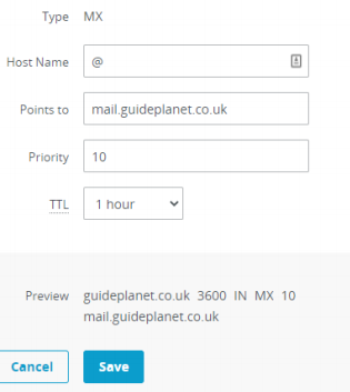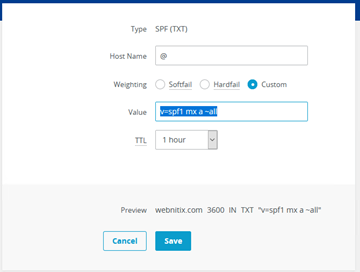 Fill out hostname: “@” and Value: “v=spf1 mx a ~all” click save: