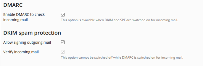 Replicate these settings, making sure “Activate mail service on this domain” and “Use DKIM spam protection system to sign outgoing email messages” is ticked