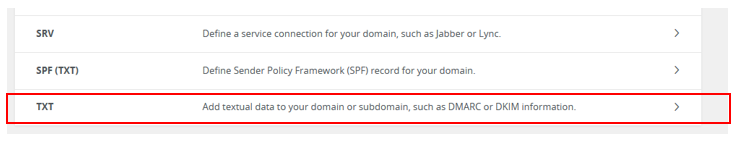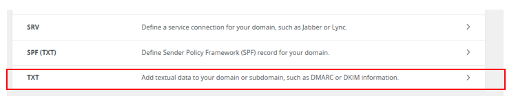 DMARC, Go to your domain DNS settings and click add record, select TXT: