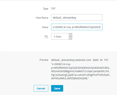 Fill out hostname: “default._domainkey” and Value: “v=DKIM1;k=rsa; p=PASTE THE KEY HERE;” click save: