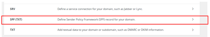 SPF, Go to your domain DNS settings and click add record, select SPF (TXT):